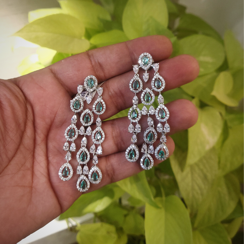 The stunning earrings consist of high-quality CZ and refreshing mint green stones. They possess a three line design and are coated in white rhodium plating.