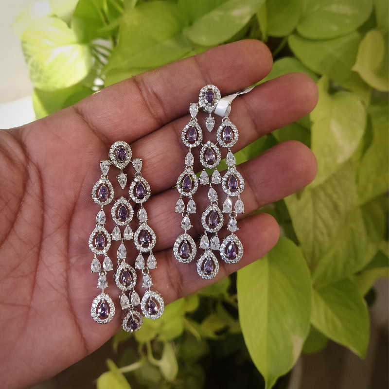 The stunning earrings consist of high-quality CZ and Purple stones. They possess a three line design and are coated in white rhodium plating.