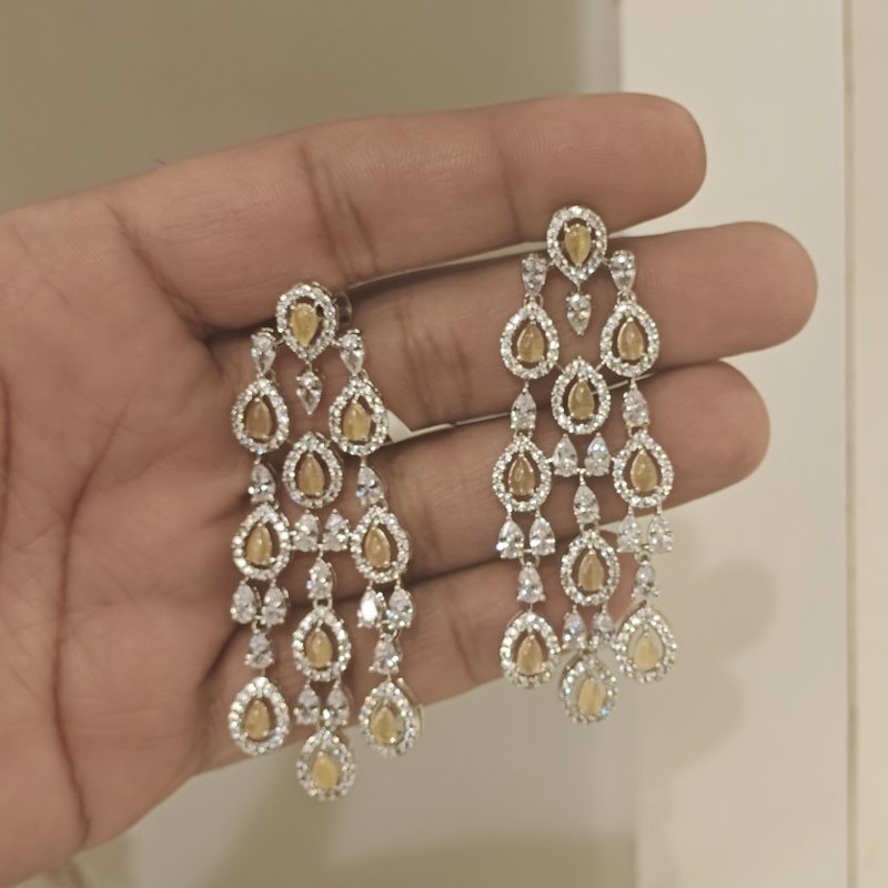 The stunning earrings consist of high-quality CZ and yellow stones. They possess a three line design and are coated in white rhodium plating.