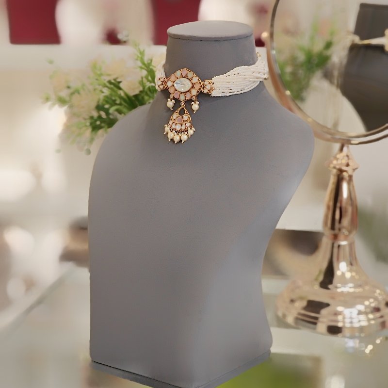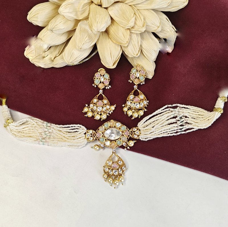 A beautifully crafted choker set with pendent adorned with pearl beads, featuring a soft and subtle array of pastel colors, coupled with a pair of stylish studs.