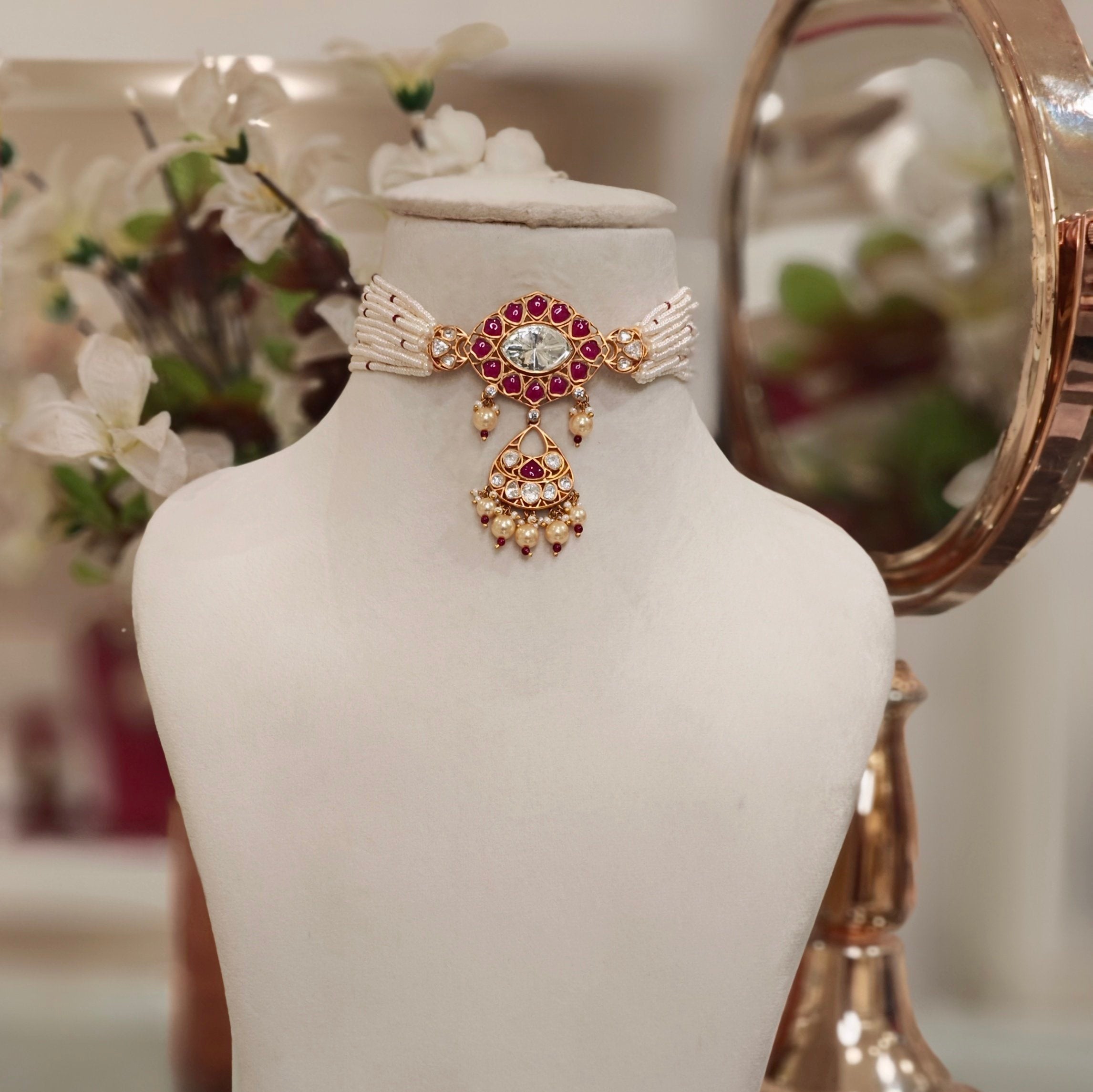 A beautifully crafted choker set with pendent adorned with pearl beads, featuring a soft and subtle array of ruby color, coupled with a pair of stylish studs.