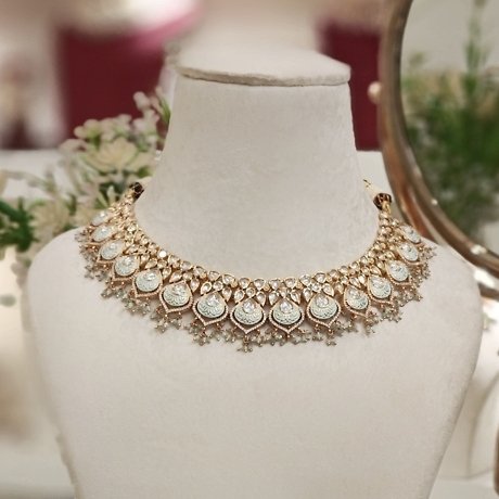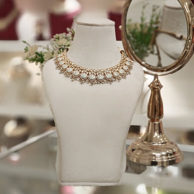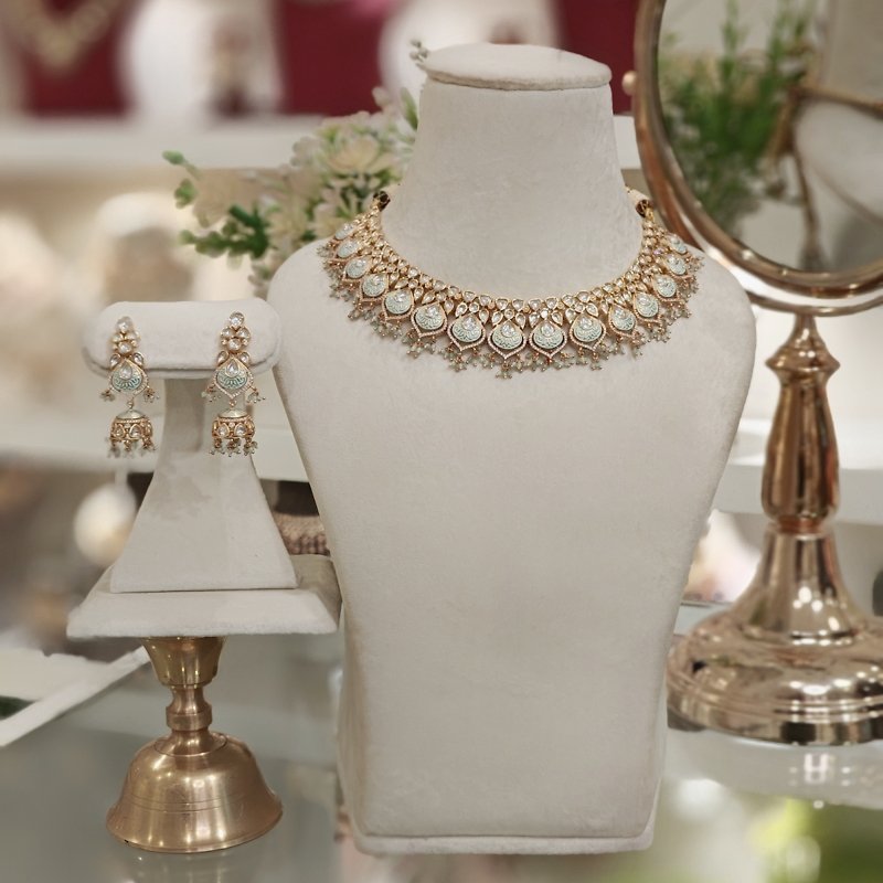 A stylish necklace collection flaunts an exquisite set of Jhumka earrings enamored in an alluring Aqua blue hue. The jewelry is further embellished with CZ and Polki stones adorned in 18Kt gold finish. The necklace is intricately handcrafted using Aqua micro beads, completing the elegant look of the accessory.