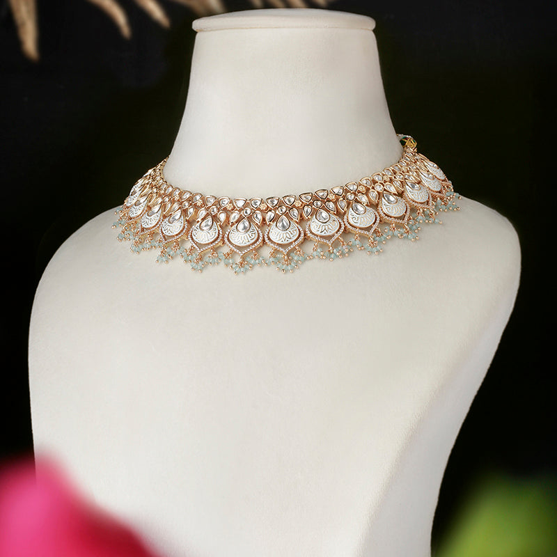 A stylish necklace collection flaunts an exquisite set of Jhumka earrings enamored in an alluring mint green hue. The jewelry is further embellished with CZ and Polki stones adorned in 18Kt gold finish. The necklace is intricately handcrafted using mint green micro beads, completing the elegant look of the accessory.