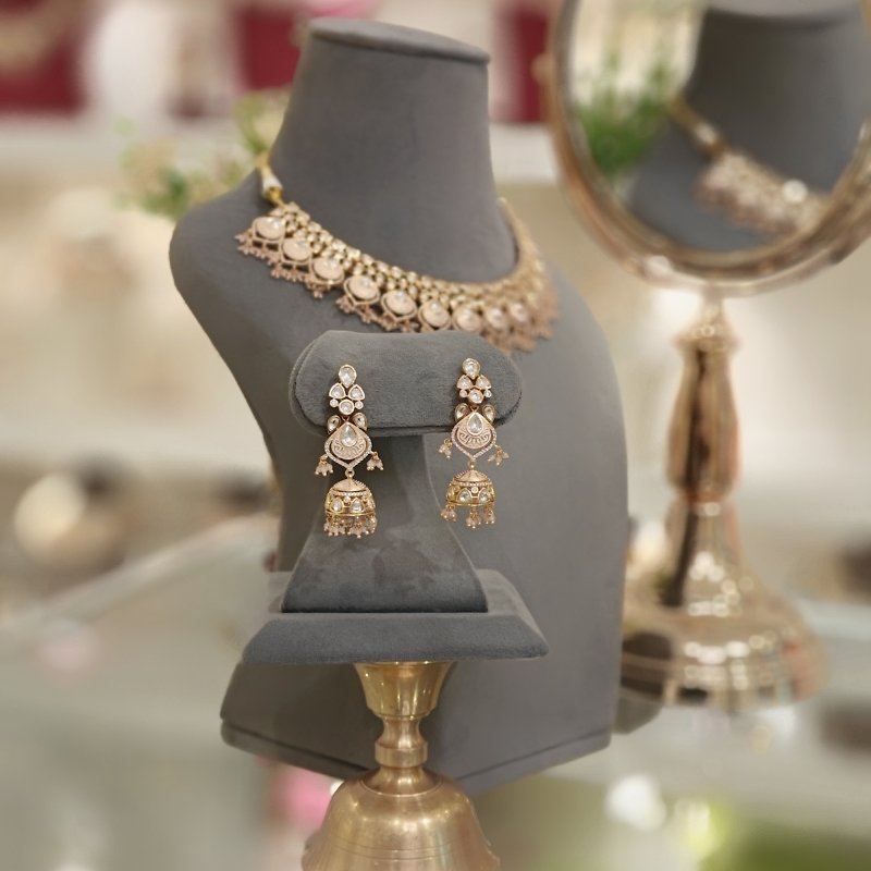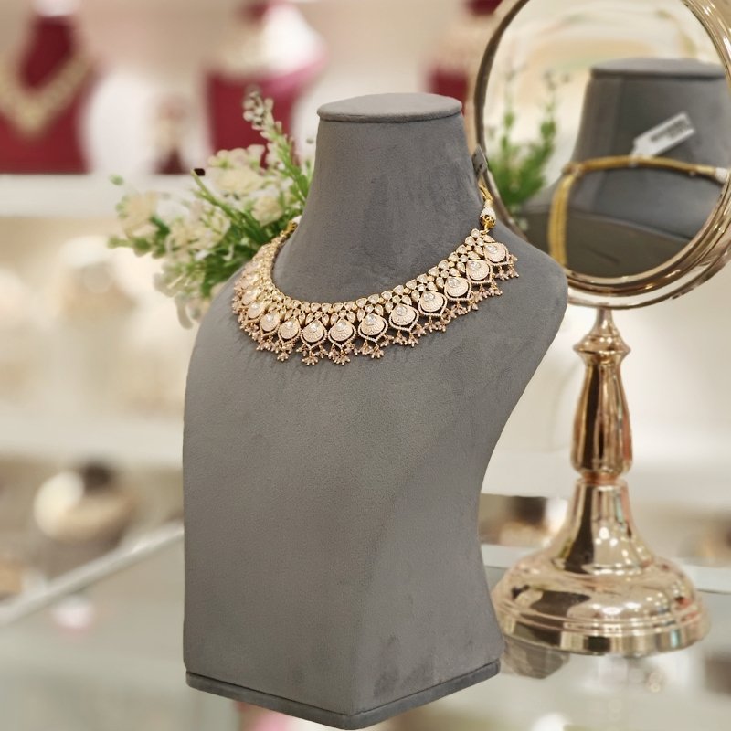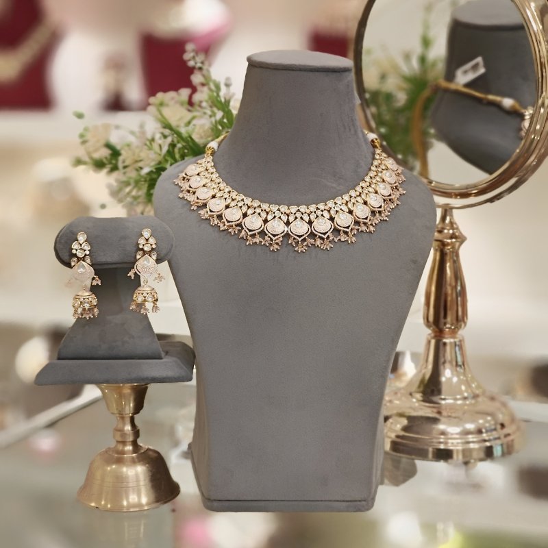 A stylish necklace collection flaunts an exquisite set of Jhumka earrings enamored in an alluring Baby Pink hue. The jewelry is further embellished with CZ and Polki stones adorned in 18Kt gold finish. The necklace is intricately handcrafted using babypink micro beads, completing the elegant look of the accessory.