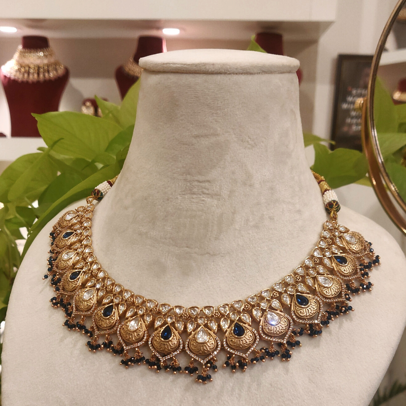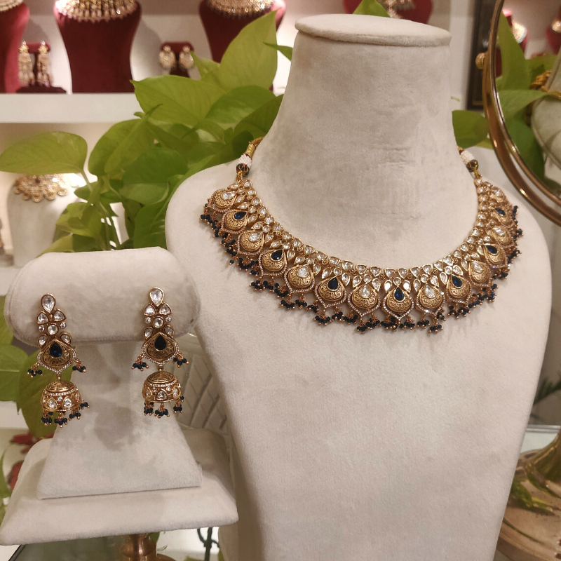 A stylish necklace collection flaunts an exquisite set of Jhumka earrings enamored in Antique gold finish with royal blue stones . The jewelry is further embellished with CZ and Polki stones adorned in 18Kt gold finish. The necklace is intricately handcrafted using blue micro beads, completing the elegant look of the accessory.