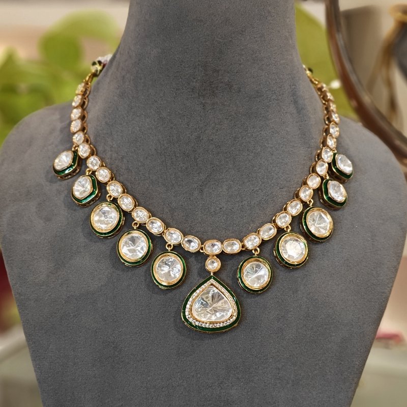 A gorgeous single-line bridal necklace only featuring Kundan Polki stones with green meenakari work around it . Plated in 22kt gold and crafted from a mixed metal alloy, this set beautifully combines traditional elegance with modern design.