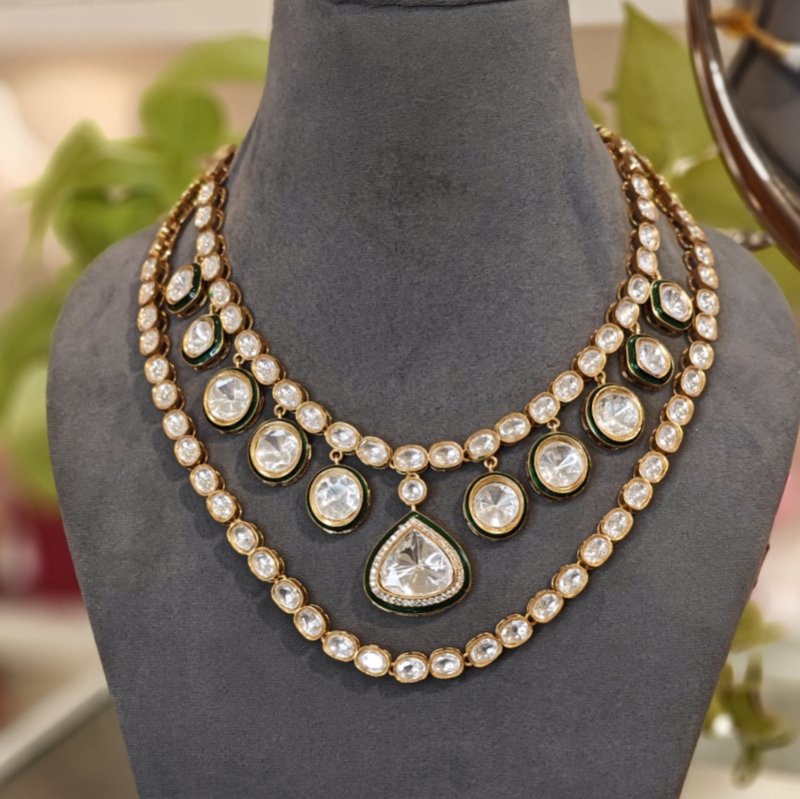 A gorgeous double-line bridal necklace set featuring Kundan Polki stones with green meenakari work around it . Plated in 22kt gold and crafted from a mixed metal alloy, this set beautifully combines traditional elegance with modern design.