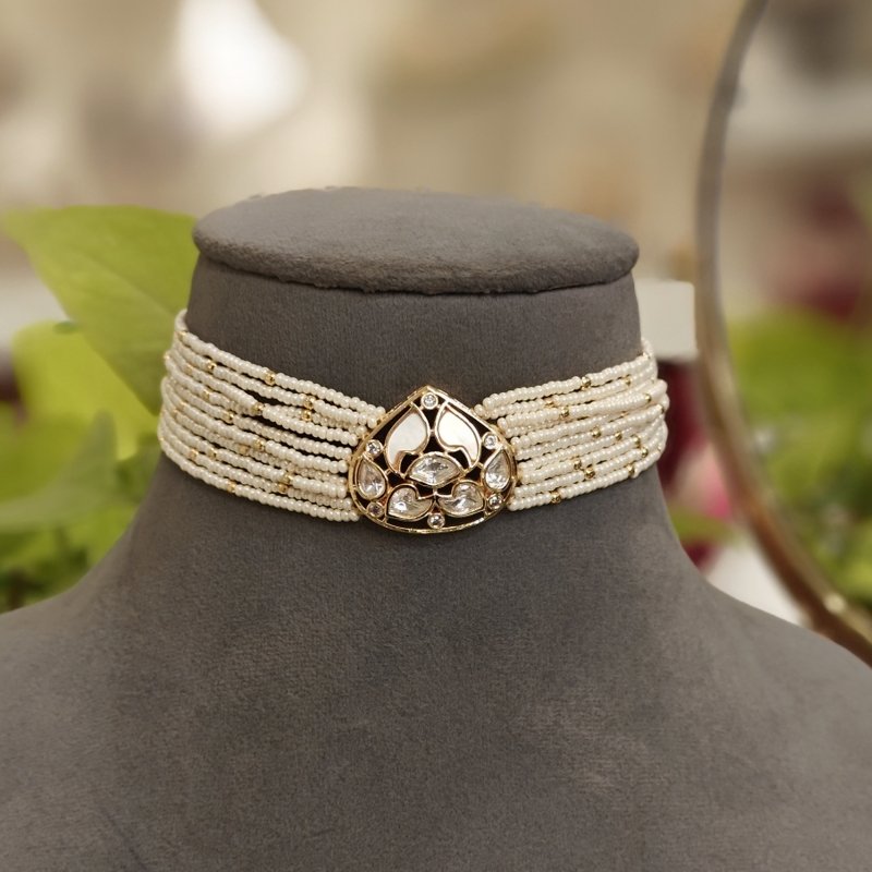 Amrit choker is designed in classy mother of pearl layer crafted in perfect size surrounded by micro cz , plated in 14 kt gold colour .