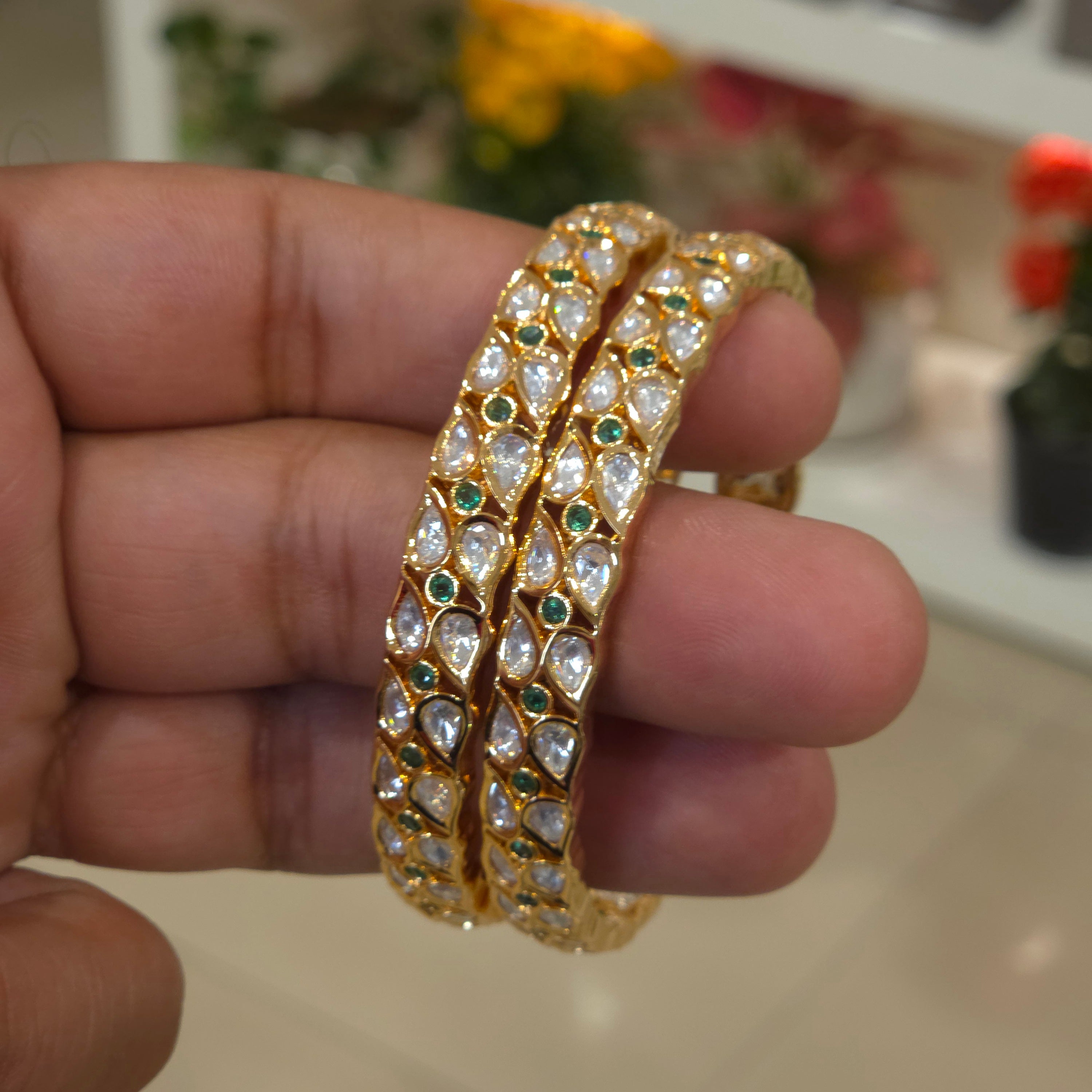 Uncut cz silver foil polki bangle plated in 22 kt gold polish with Red an green stones .
