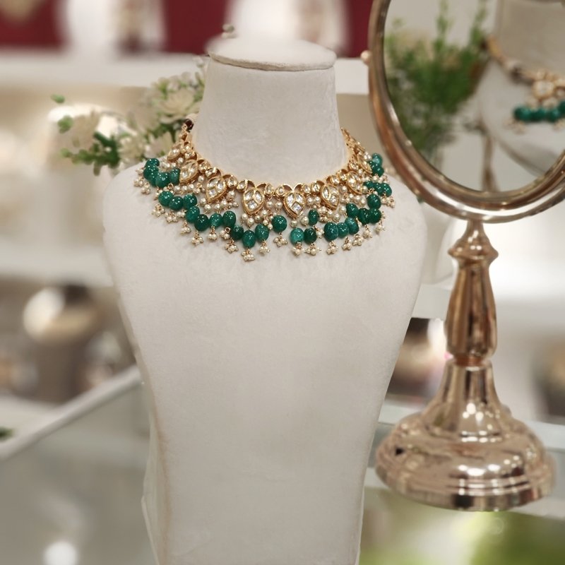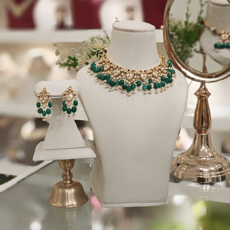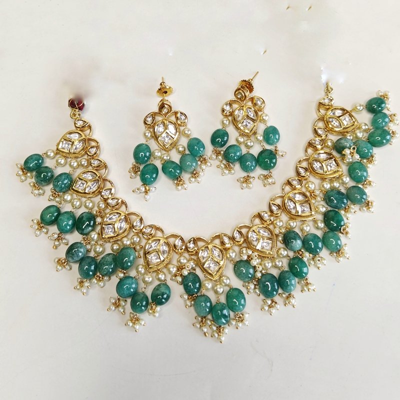 This Amrita necklace and earring set features artificial polki and green beads, with a light weight design and 22 kt gold plating.