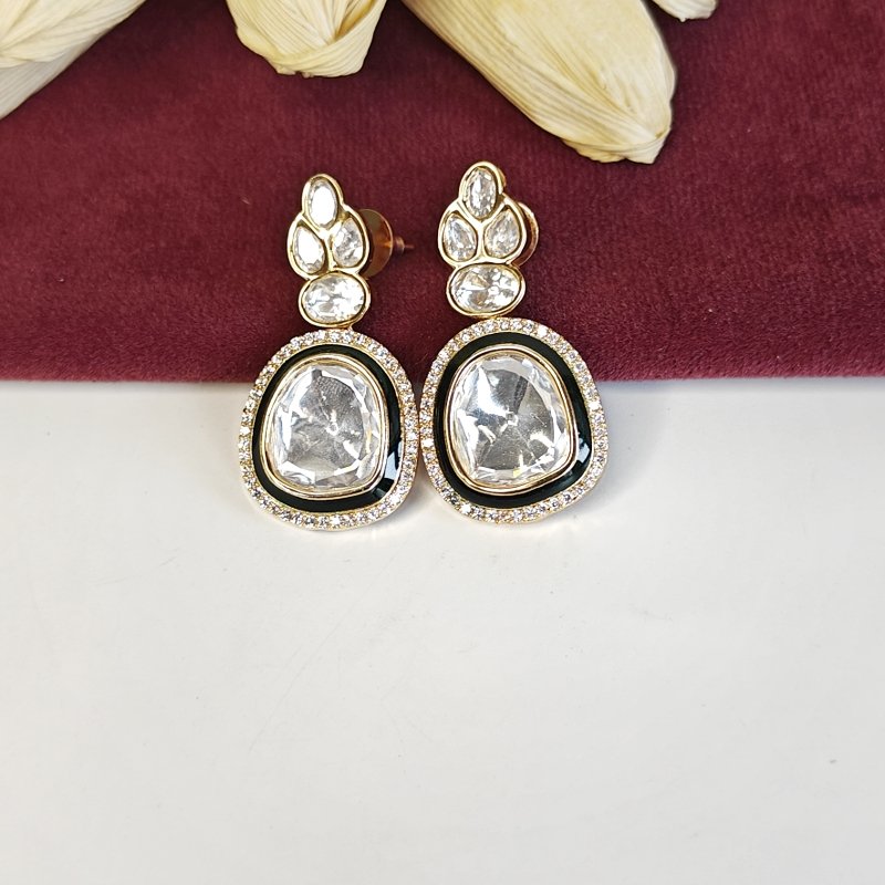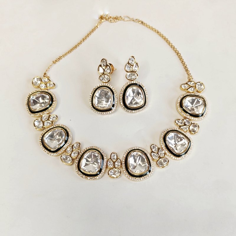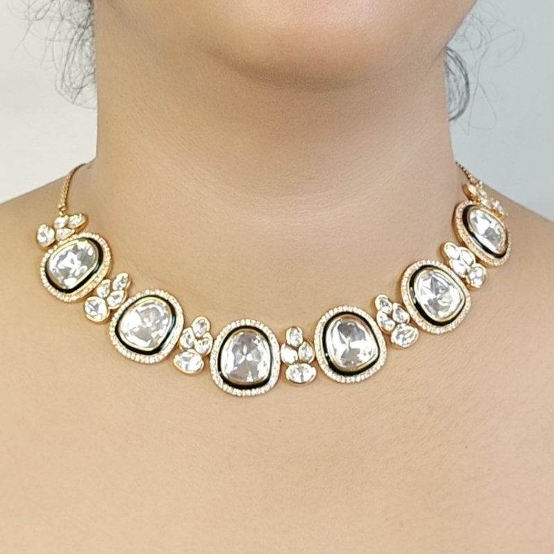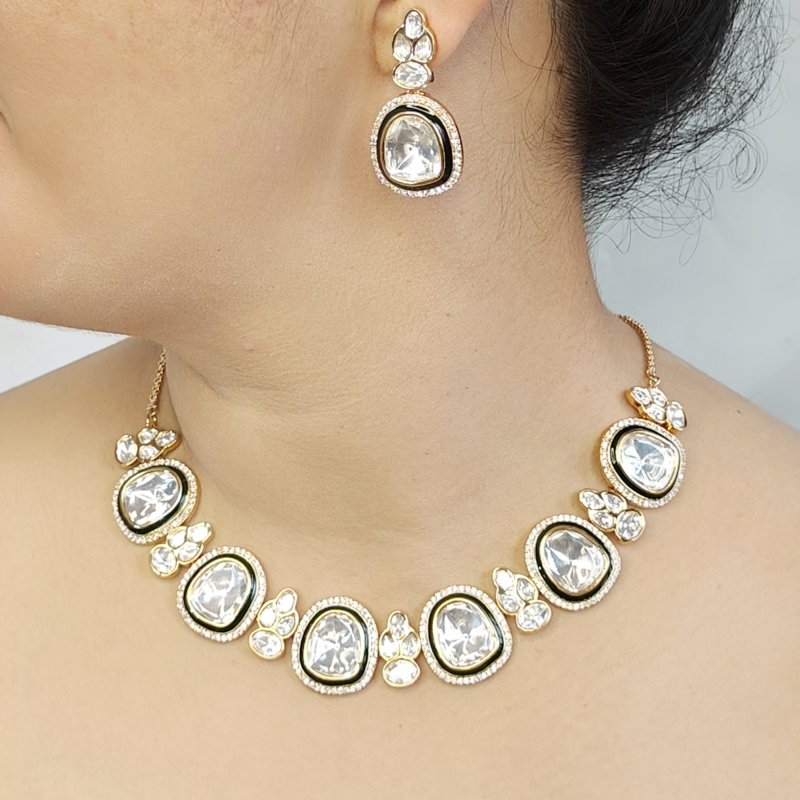 This necklace set is incredibly adaptable and is crafted using polki stones and cz, encircling deep green meena work that are coated in a 22 kt gold hue.