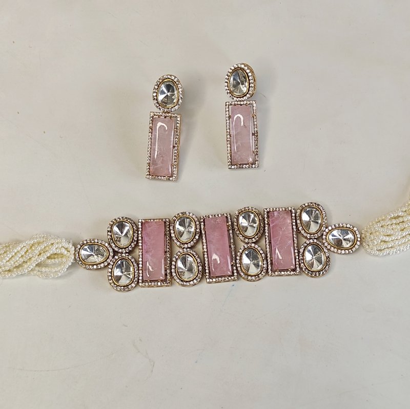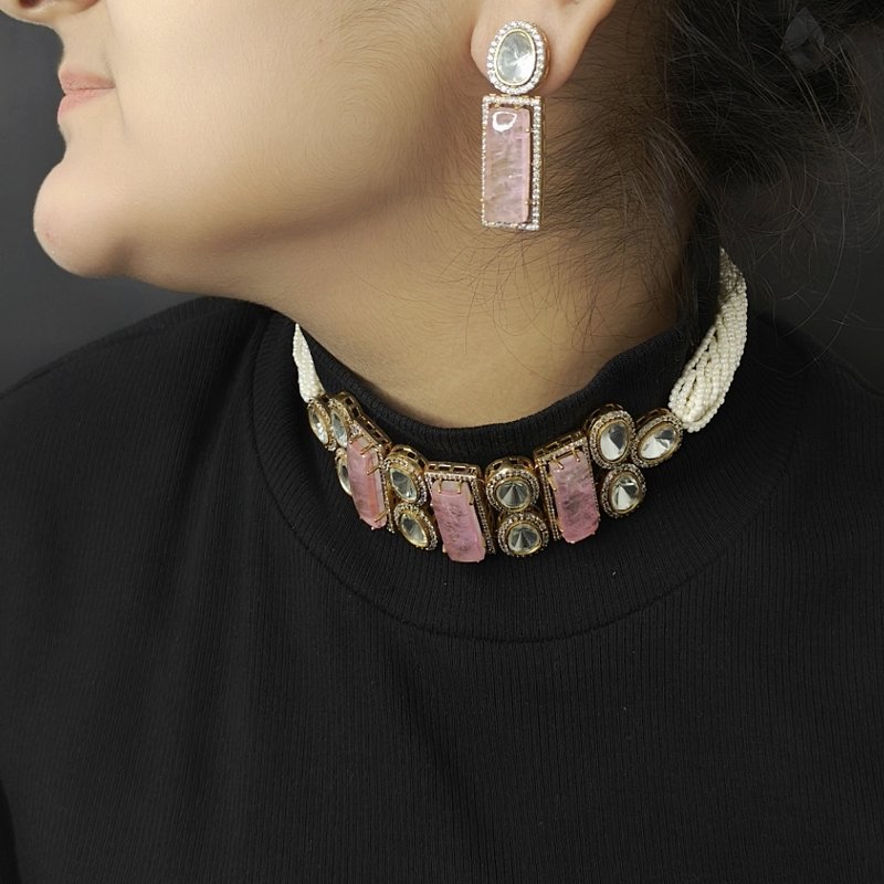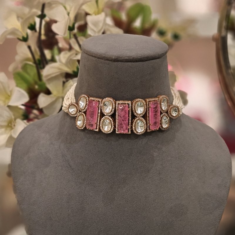 Crafted from polki, this choker set is remarkably lightweight. The rectangular, red doublet stone at its center is adorned with sparkling cubic zirconia stones and finished with a combination of white and gold plating.