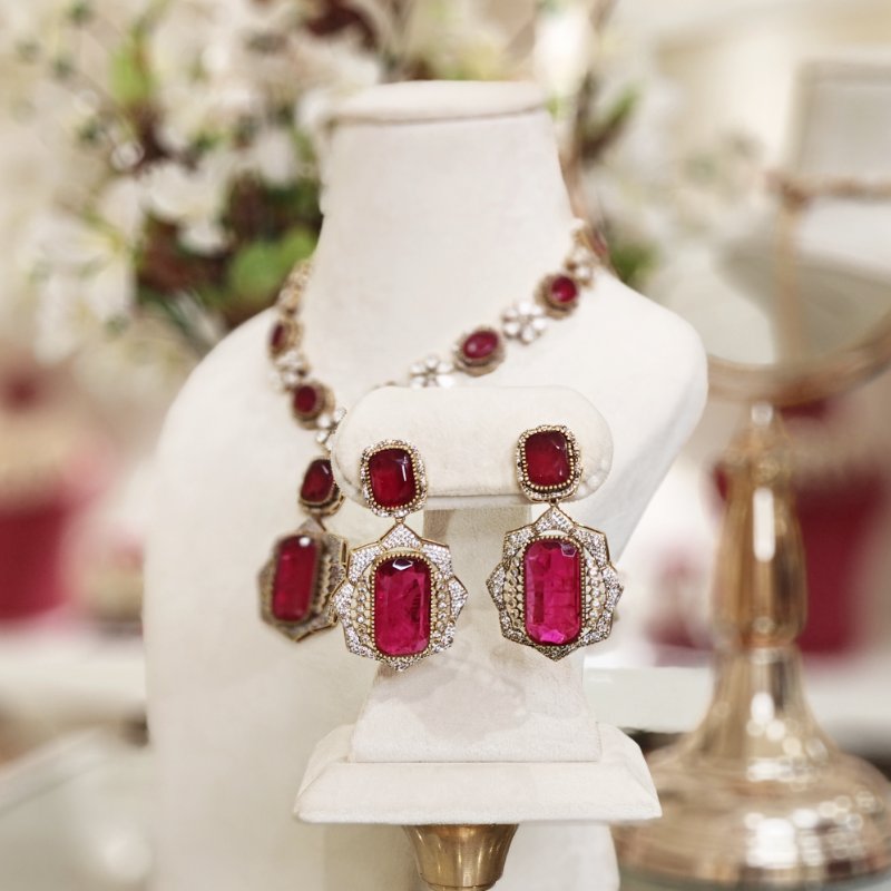 A necklace set designed with Ruby coloured Doublet semi precious stone surrounded by small CZ stones arranged in a micro pave setting and plated in antique mehandi vicotorian polish.