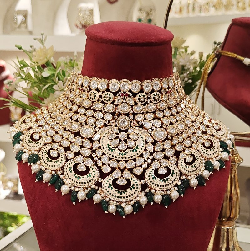 This bridal jewelry set includes earrrings , maangtikka and necklace set beaded in emerald green and pearls ,made with finest quality polki stones,adorned with green and ivory colour enamel work .