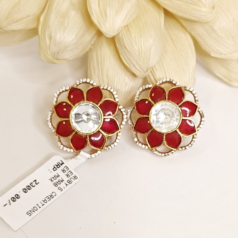 These large studs feature ruby-coloured pota stones in petal shape with big sizes round moissanite polki stone, with bombay clasp at the back. They are plated in 22 kt gold, creating a luxurious and elegant look.