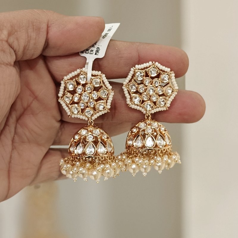 Arvita jhumkas are made in finest quality uncut CZ polki which is real replica of diamond polki stones .Metal used is silver mixed metal alloy and plated in 22 kt gold ,beaded in off-white pearls .can be customised to any colour of your choice ( subject to availability).