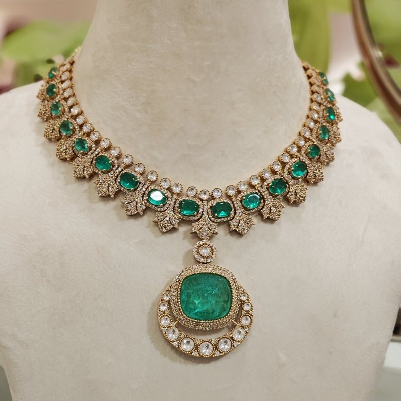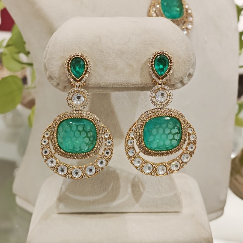 A jewelry set designed for brides consisting of an uncut polki Necklace and large chaandbali earrings. Both pieces are studded with CZ stones and plated in 22 kt gold. The choker is also adorned with double emerald green stones beads giving it rich and luxurious look