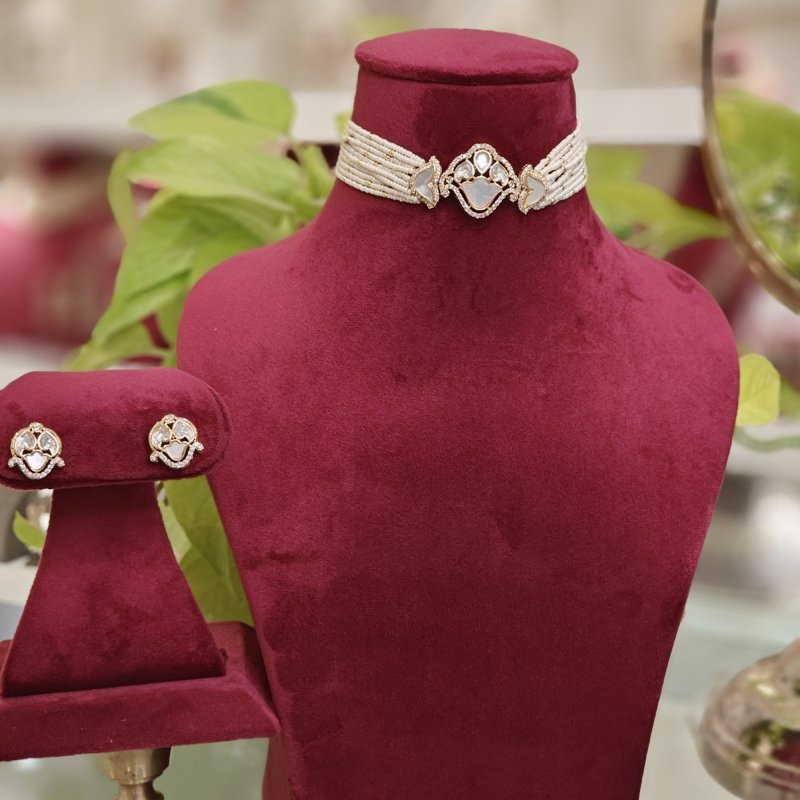 Anchit choker is designed in classy mother of pearl layer crafted in perfect size surrounded by micro cz , plated in 14 kt gold colour .