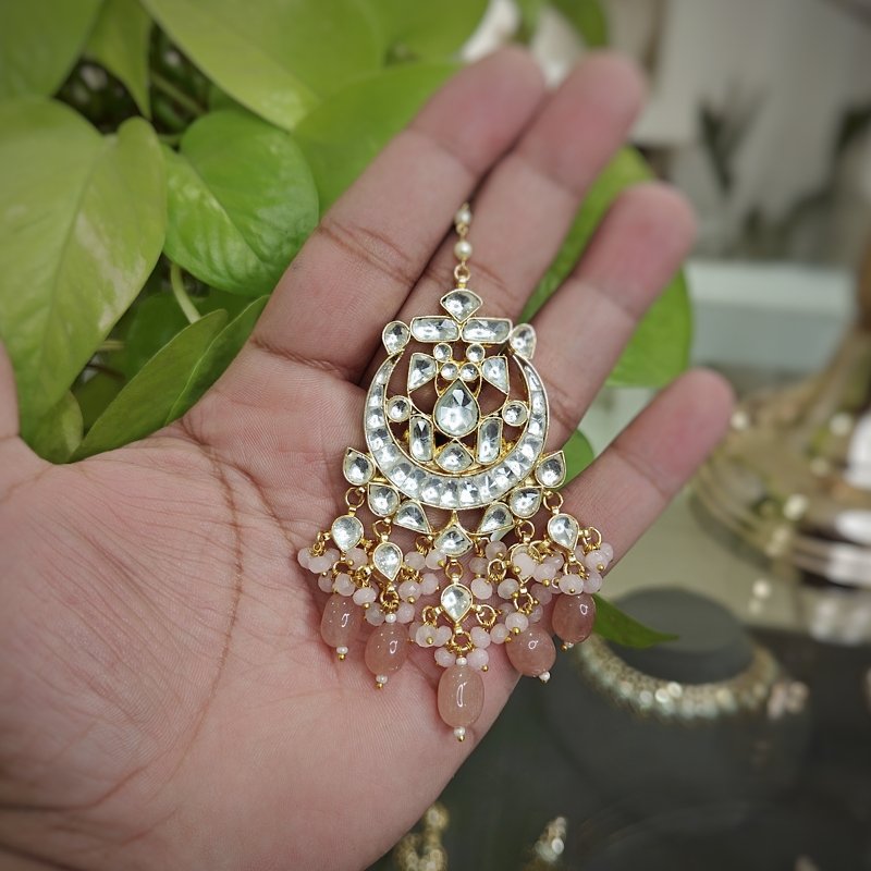 Crafted with the finest ahmdabadi paachi kundan , this maangtikka is made in chaandbali pattern with kundan saru hanging at the bottom beaded with peach hydro beads giving it a longer look .