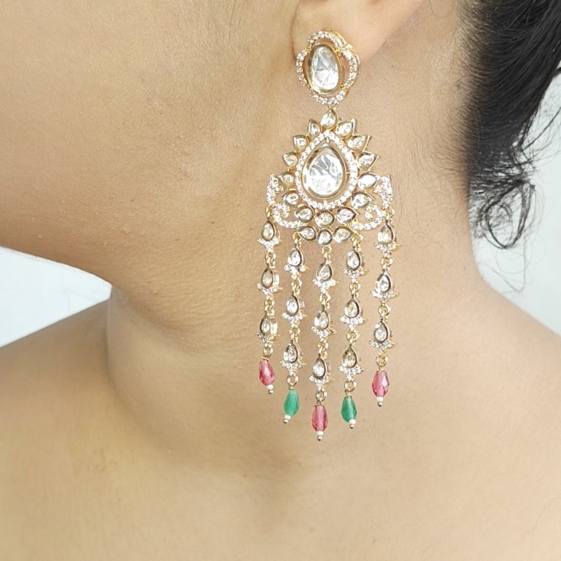Aneesha indo- Western earrings are made in light weight workmanship with Uncut polki stones teamed up with cz studded in micropave setting and beaded with emerald green and pink coloured beads .