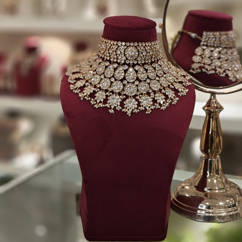 Heavy look bridal set with chaand Bali crafted in faceted cz polki stones and plated in 18 kt gold .Metal used is silver mixed metal alloy ..