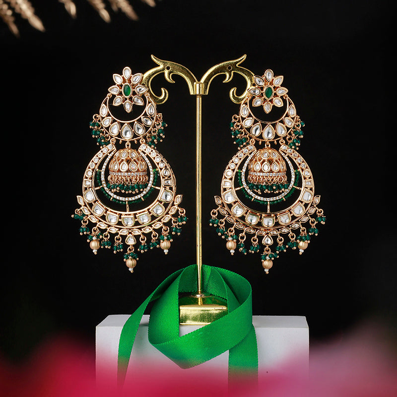 This bridal jewelry set includes a double layer necklace designed with artificial polki stones and adorned with bottle green hydro stones. Accompanied by the set are large chand bali earrings.
