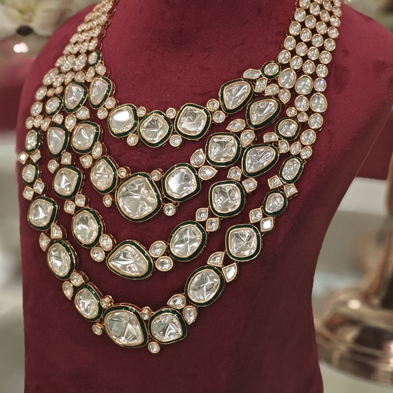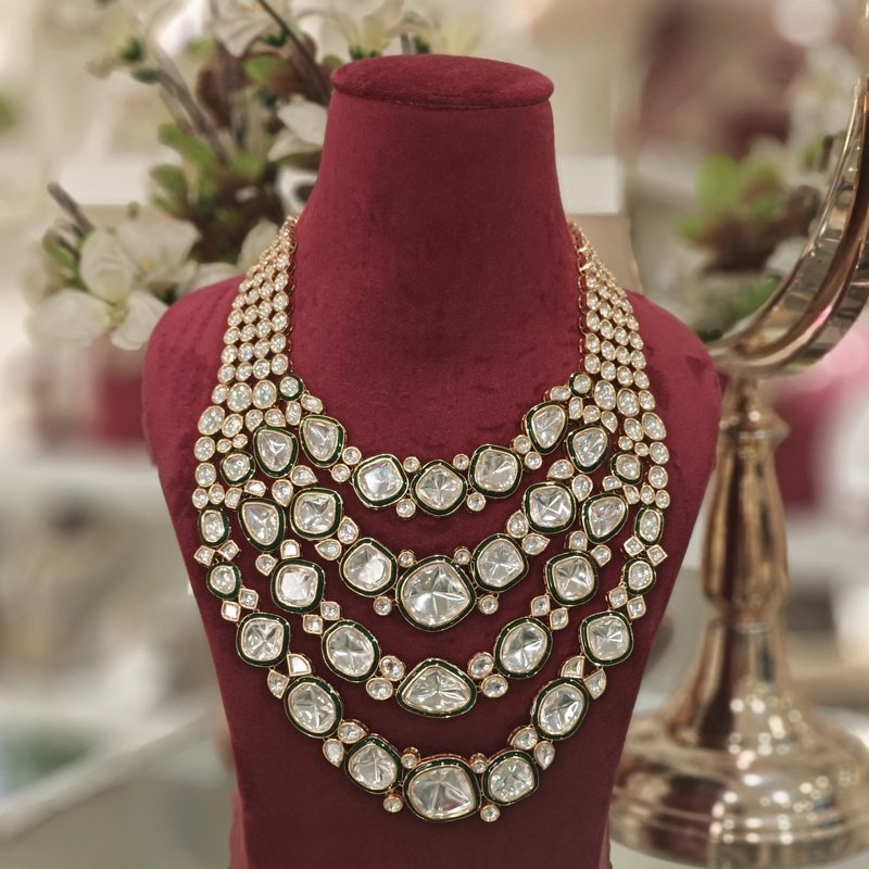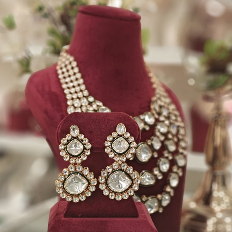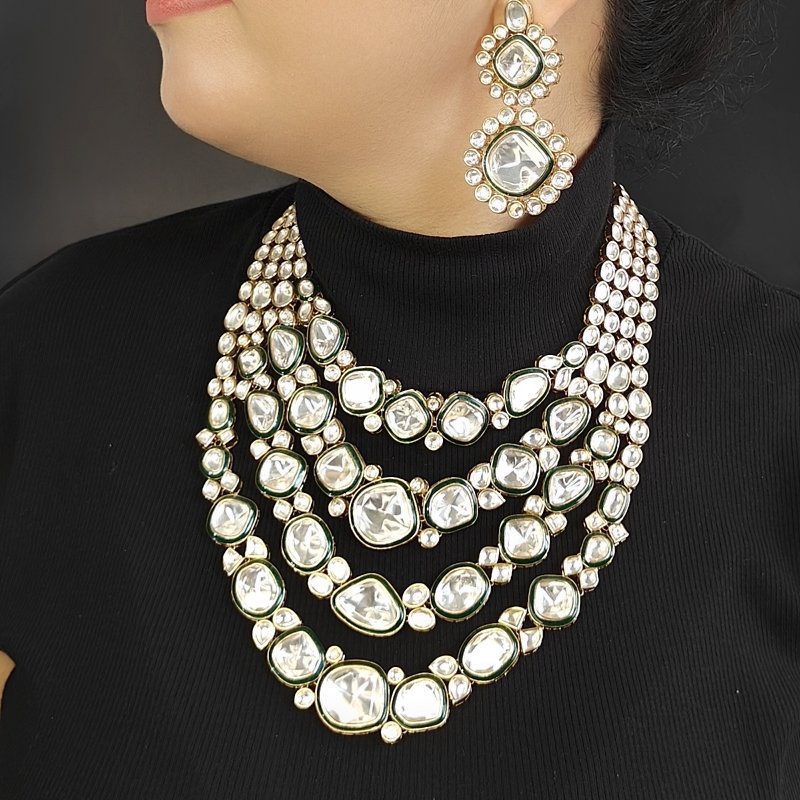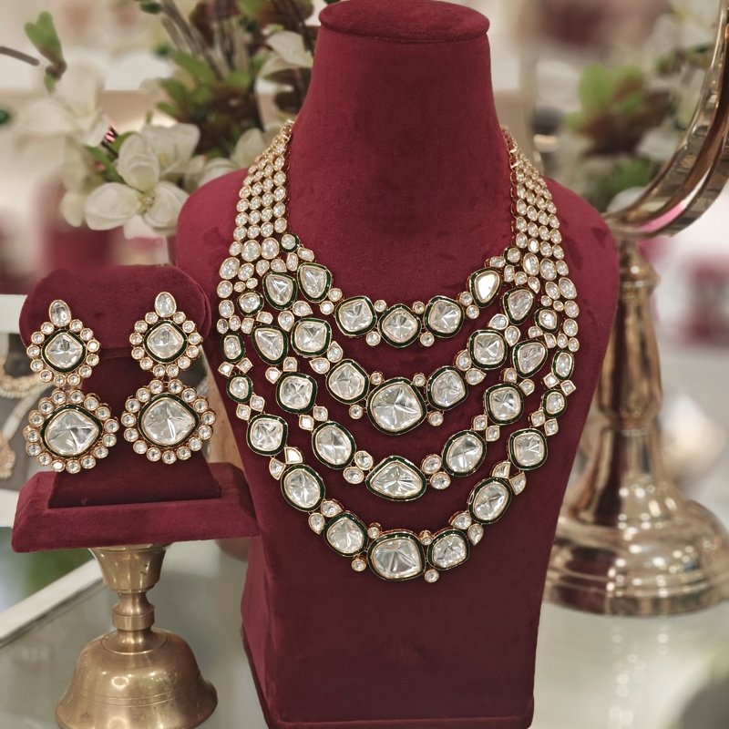 This bridal necklace set is made in royal look having 4 line designs in uncut kundan polki with green meenakari on the sides . This set is plated in 18 kt gold plating to give it real and royal look .