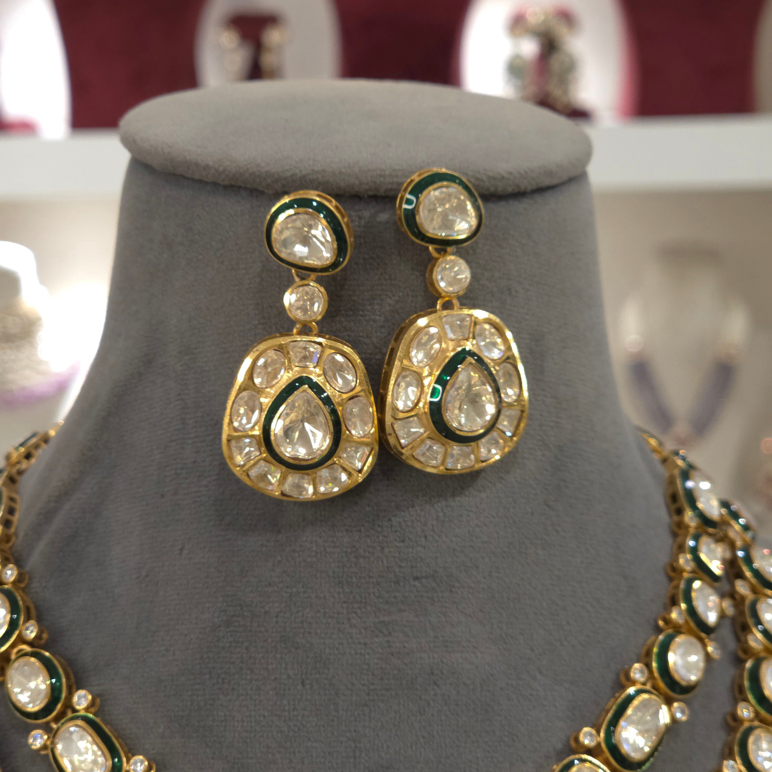 The Anukriti moissanite polki set features a unique design incorporating moissanite polki with green enamel detailing, providing a striking visual contrast. The gold plating enhances its durability and luster, making it an elegant addition to formal attire. This necklace set combines aesthetic appeal with high-quality materials for lasting wear.