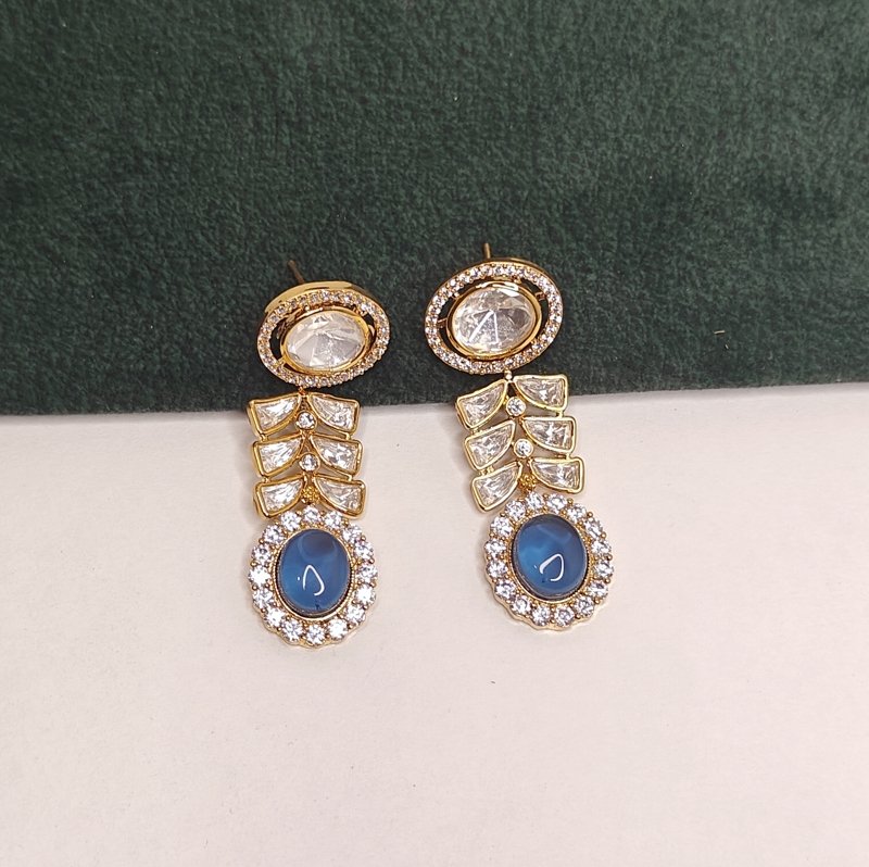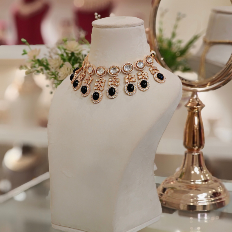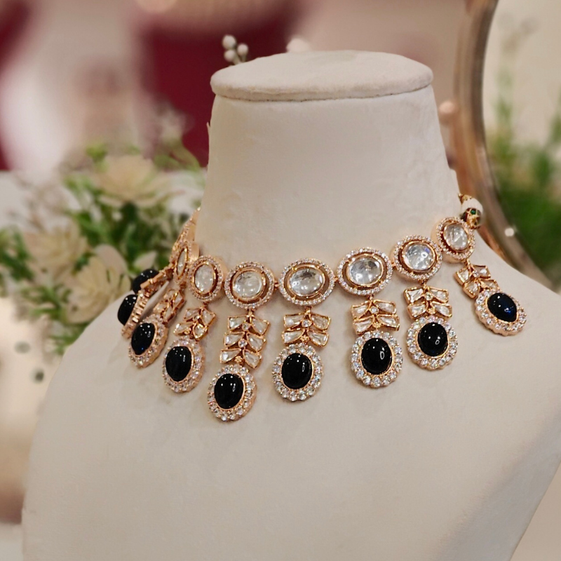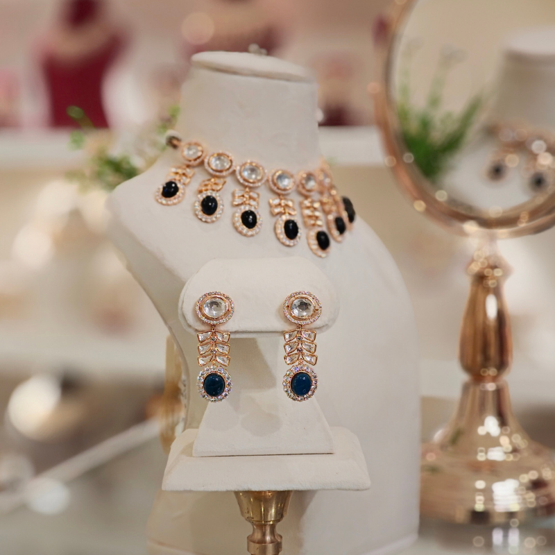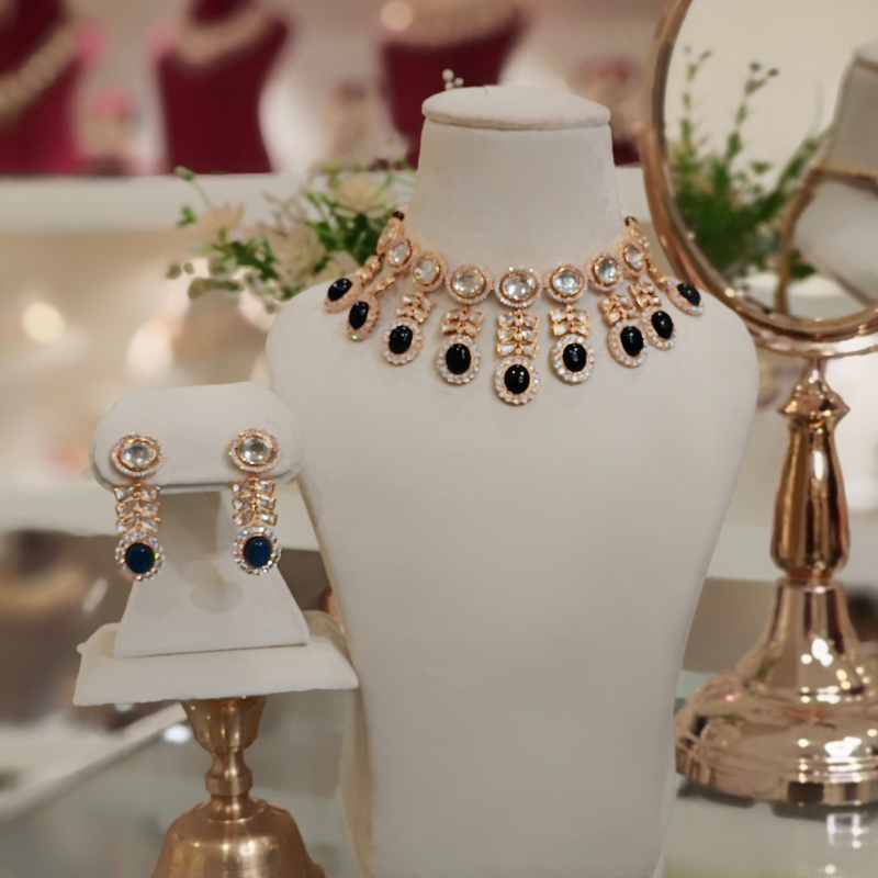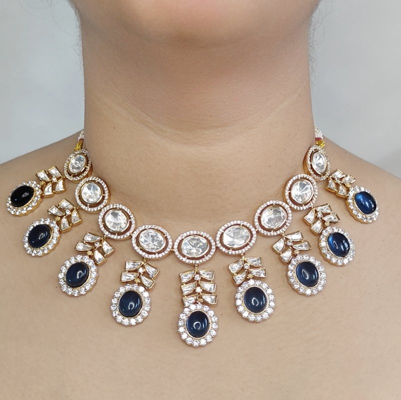 This necklace set is incredibly adaptable and is crafted using polki stones and cz, encircling deep blue stones that are coated in a 22 kt gold hue.