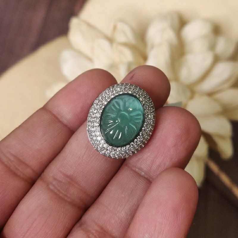 Anusha ring is made in oval shaped designs with mint green handcarved stone at the center surrounded by cz on the sides .