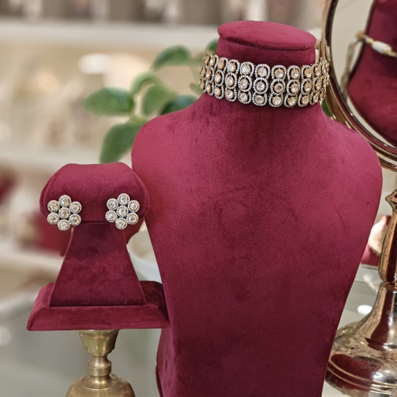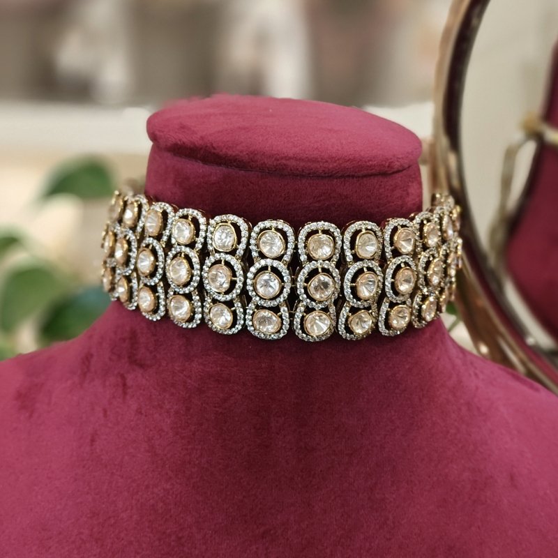 This exquisite choker bridal necklace set is a true masterpiece, studded with uncut CZ Polki stones, sparkling cubic zirconia. Plated with antique victorian plating , it exudes timeless elegance and luxury, making it the perfect choice for brides seeking a blend of traditional charm and contemporary brilliance.