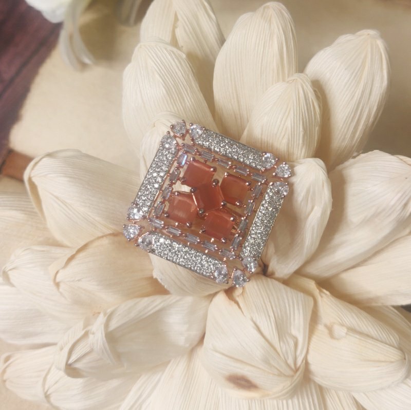 Anvi ring is made in square shaped design with peach stones at the center surrouded by cz stones on the side .