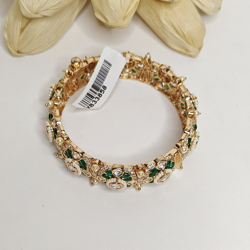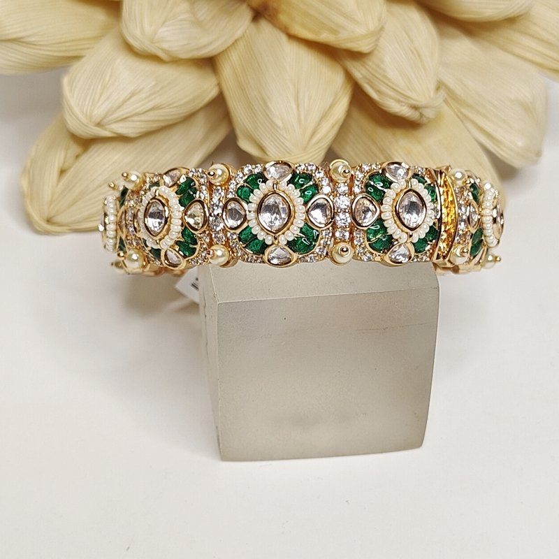 This statement bangle features green pota stones, star CZ, and uncut silver foil polki stones .A beautiful piece which can we worn on any occasion and goes with maximum colours