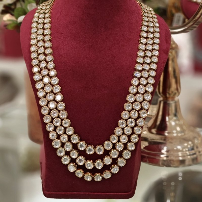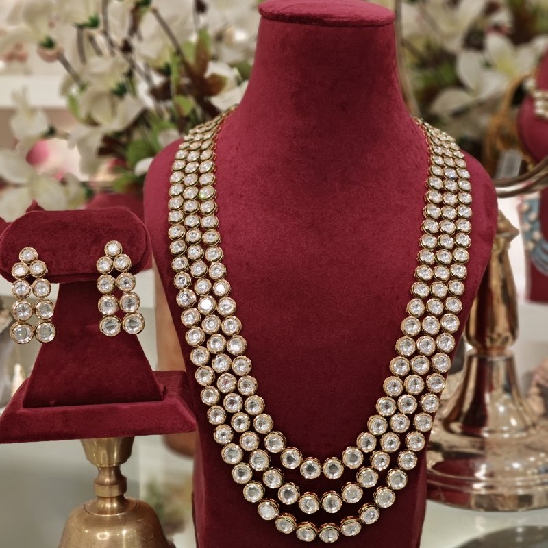 This bridal necklace set is made in royal look having 3 line designs in uncut kundan polki with green meenakari on the sides . This set is plated in 18 kt gold plating to give it real and royal look .