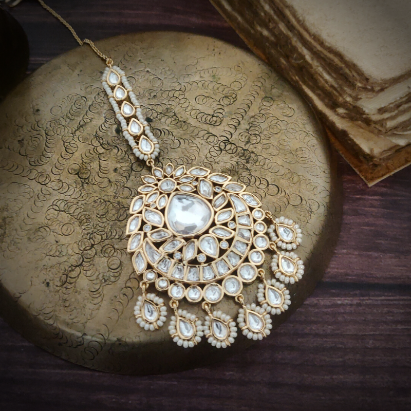 Adorn yourself with the ultimate fashion accessory of maang tikka that is made with artificial polki and enriched with an 18 kt gold coating. The beauty of this jewelry is amplified by the delicate pearl beads which amplify its charm. This embellishment is perfect for any traditional outfit and it adds sophistication to your overall persona.