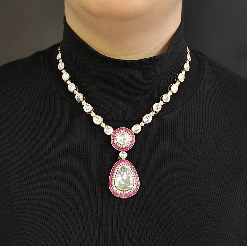 Charisma stunning moissanite polki necklace set made in single line design studded with cz and hot pink pota stone in invisible setting ,paired with a pair of studs with bombay clasp at the back