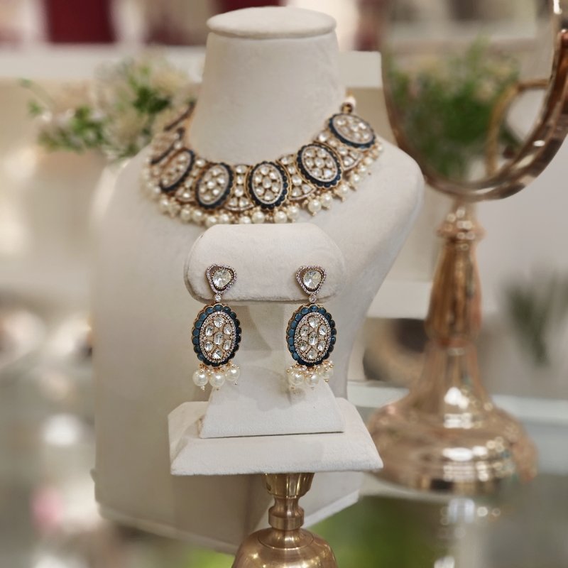 Crafted with care, this necklace set boasts a 14-karat gold plating that is exquisitely adorned with unrounds artificial polki stones surrounding blue pota stones, all complemented by cz stone settings and beaded with off white pearls