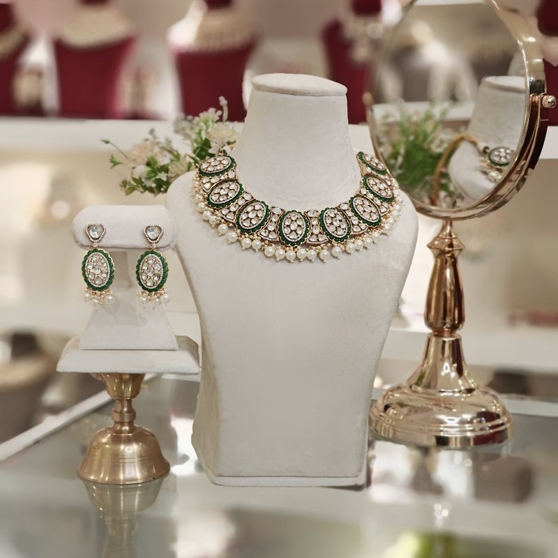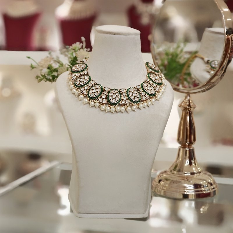 Crafted with care, this necklace set boasts a 14-karat gold plating that is exquisitely adorned with unrounds artificial polki stones surrounding Emerald coloured stones, all complemented by cz stone settings and beaded with off white pearls