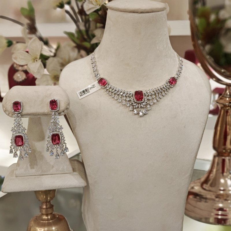 A beautiful elegant necklace set created with ruby wine transparent stone with cubic zirconia on sides , finished with silver rhodium plating, this necklace set come with extra long earrings .