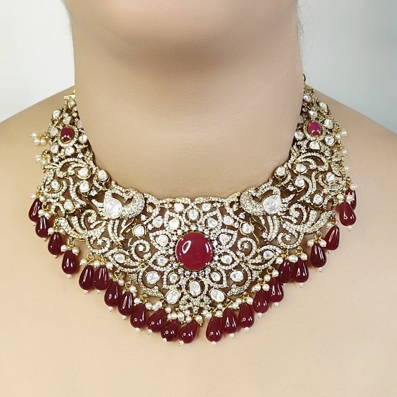 A bridal neckline set crafted using moissanite polki and cz stones,plated in antique mehandi polish ,this set gives look of real diamond polki jewellery. Adorned with stunning ruby coloured stones and eye-catching statement long danglers.