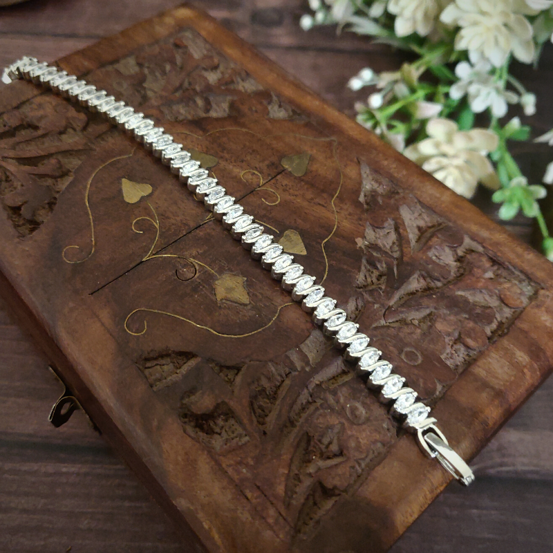 A sleek bracelet with a diamond-inspired design, adorned with marquise shaped CZ stones and plated in white rhodium polish.
