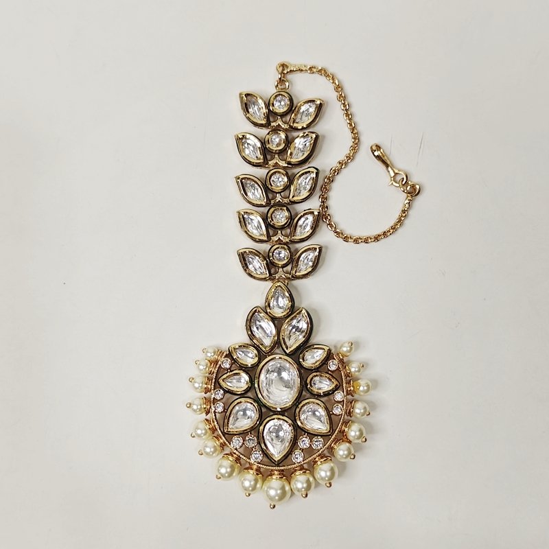 A stunning maangtikka featuring intricate design, adorned with Kundan Polki stones, and beautifully beaded with pearls , creating an elegant and timeless accessory.