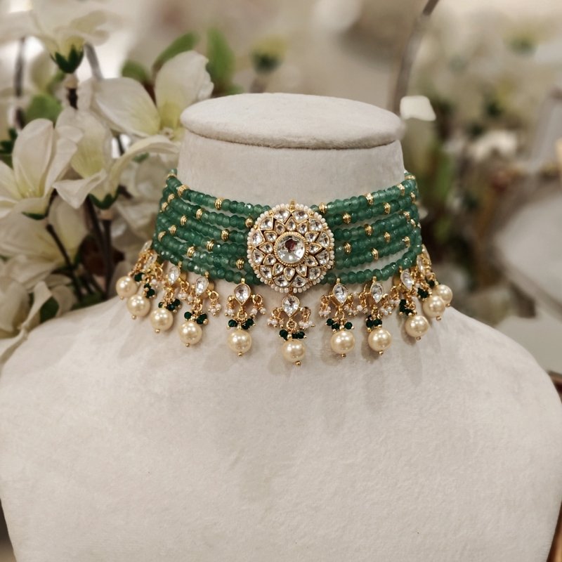 Aroona choker is medium weight and crafted in paachi kundan workmanship ,plated in 22 kt gold .this choker comes with a pair of studs and beaded in emerald green coloured bati stones with pearls .