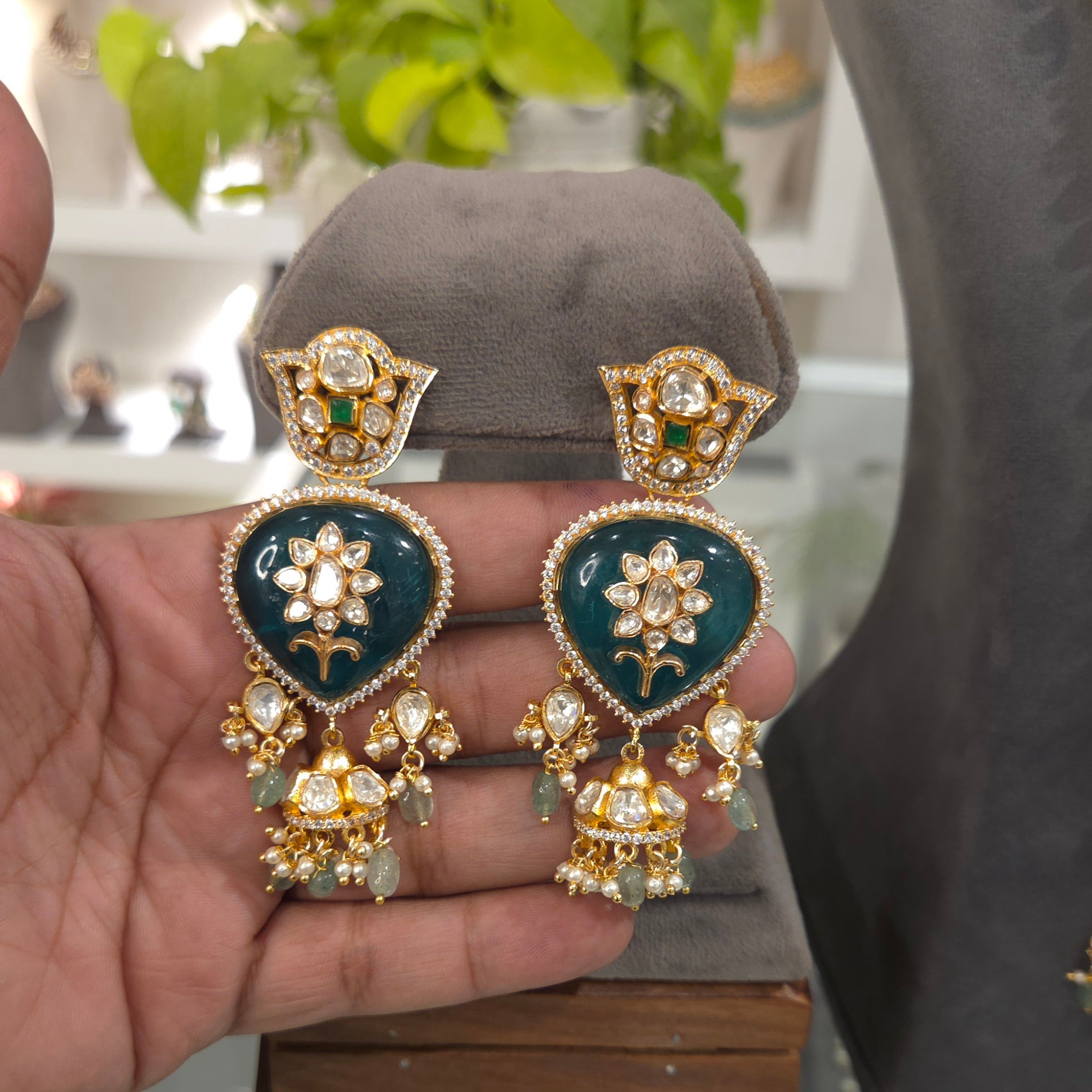 Beautiful statement long set / rani haar made with intricate peacock design and studded with pota green stone and moissanite polki , special work of tanjore artistry is done on the stone which is an ancient art of rajasthan. Plated in 22 kt gold polish and crafted in brass mixed with other alloys and beaded with strawberry emerald beads ,this is purely a piece of art