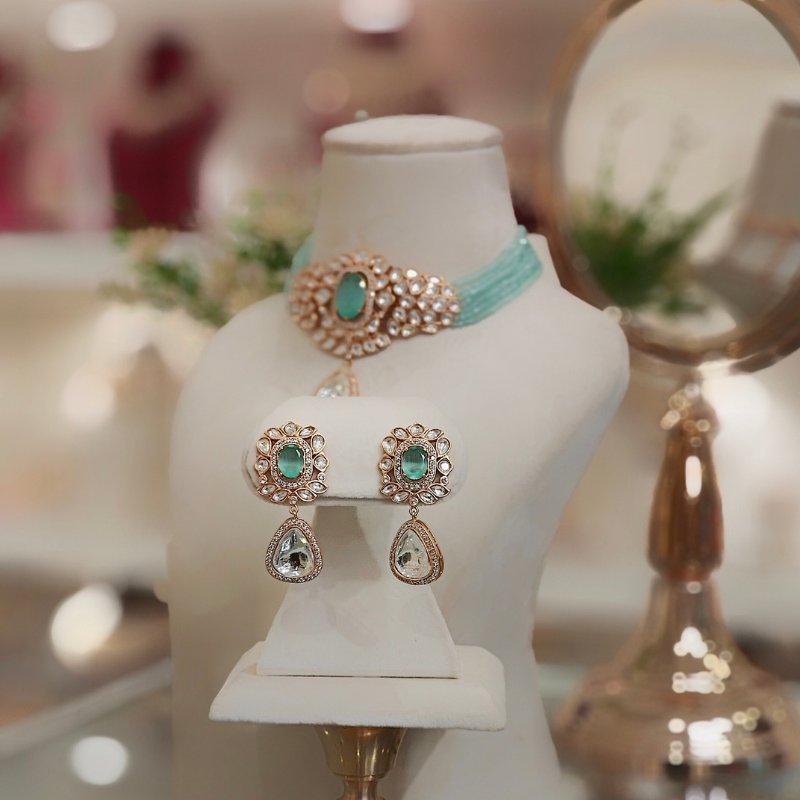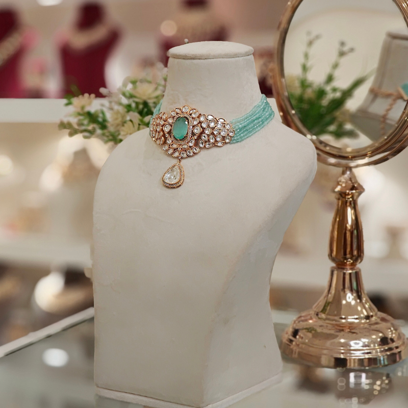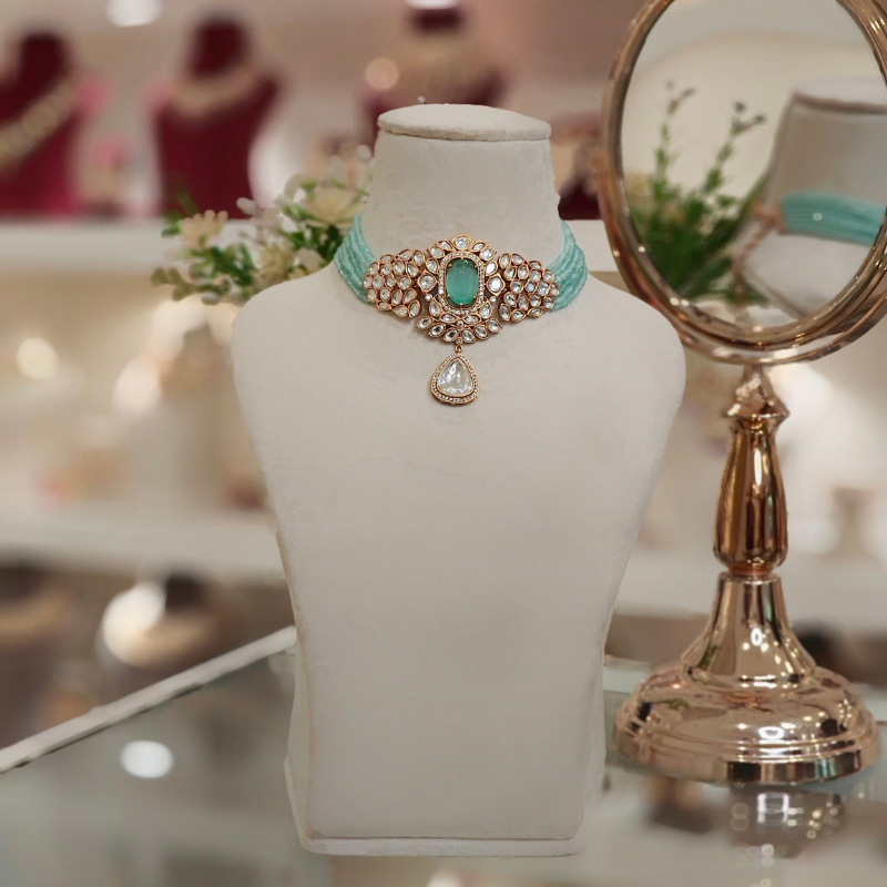 This stunning choker necklace set showcases polki stones and is plated with 22 karat gold color. A Green colored Hydro stone is featured at its center along with big polki .while the set comes with beautiful pair of studs and big polki stone hanging at the bottom .