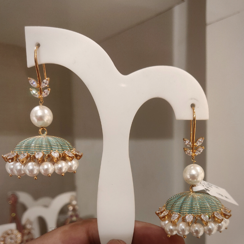The mint green enameled jhumka, plated with 18 kt gold colur, has been embellished with cz stones, and features pearls surrounding the jhumka .