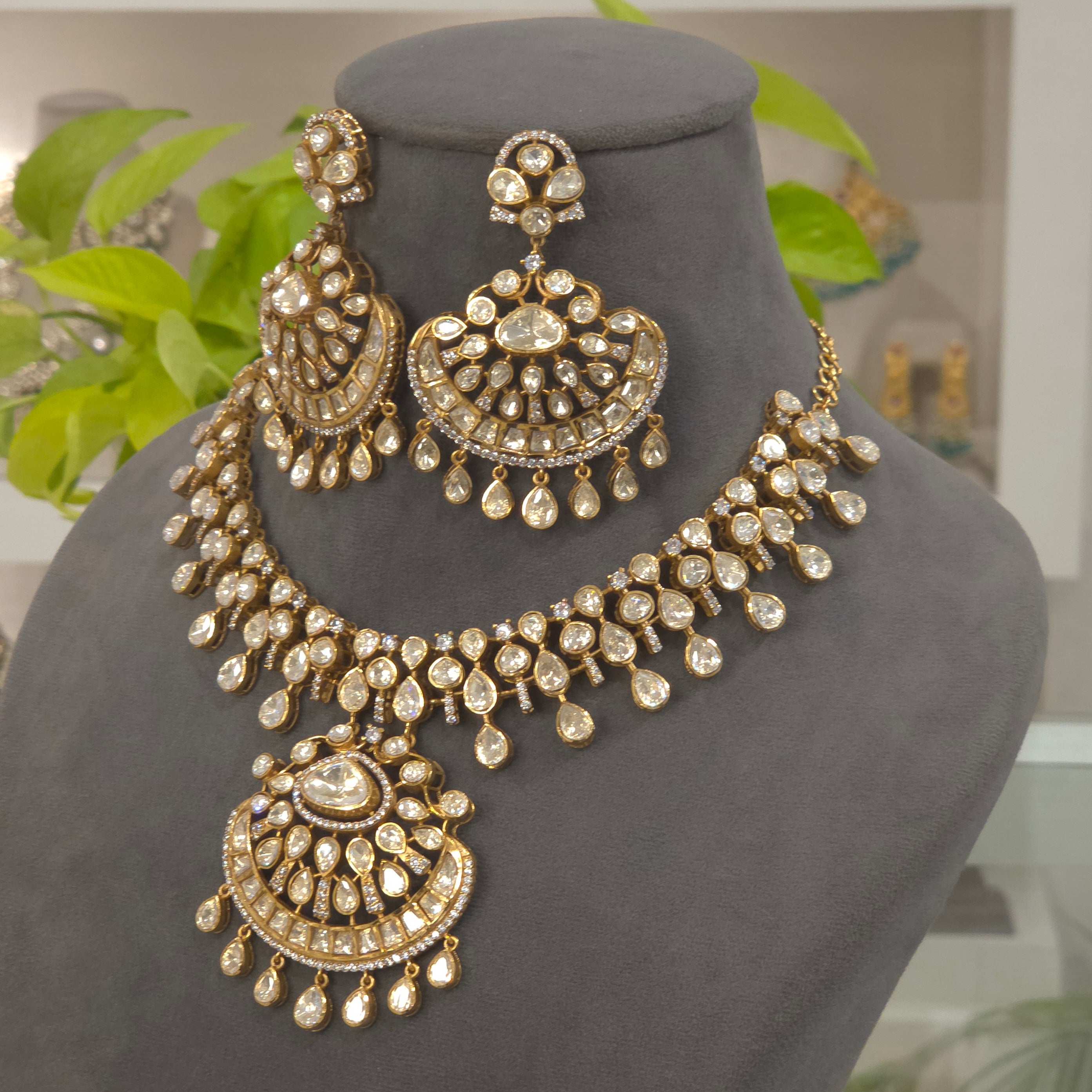 The Arushi Moissanite Set is a stunning statement piece, featuring LB top shade Moissanite polki and plated in 22 kt dip gold. This versatile set can be paired with any dress color and is ideal for destination weddings, anniversaries, and home functions. Crafted with a silver mixed metal alloy, it offers timeless elegance and style.