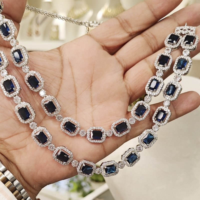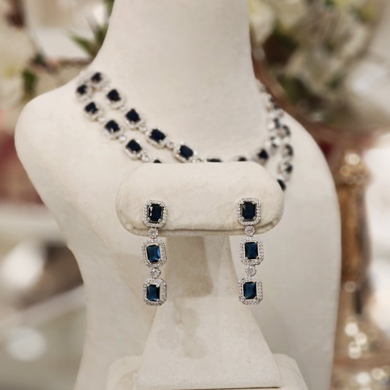 A stunning set featuring an Indo-Western neckline and long dangling earrings crafted with CZ and Royal blue hydro faceted stones, all coated in white rhodium plating.
