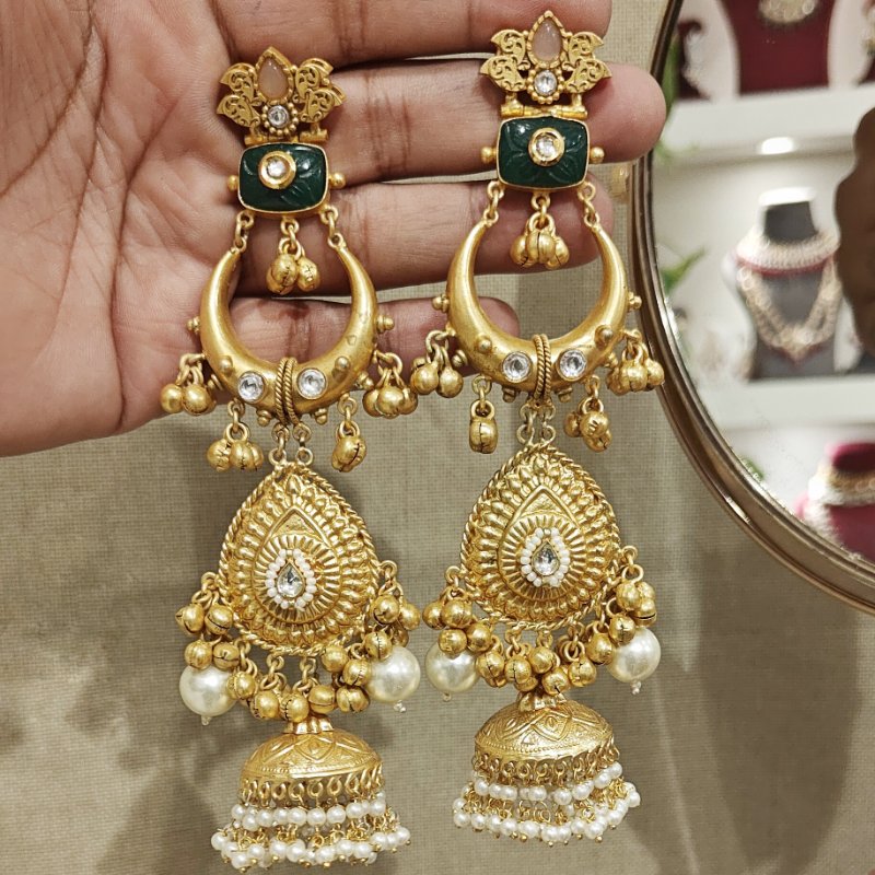Geru polished Ashi Heritage earrings ,made with polki and pearls in half moon design,attached with jhumkas and plated in 22 kt gold ,in shoulder length size . .