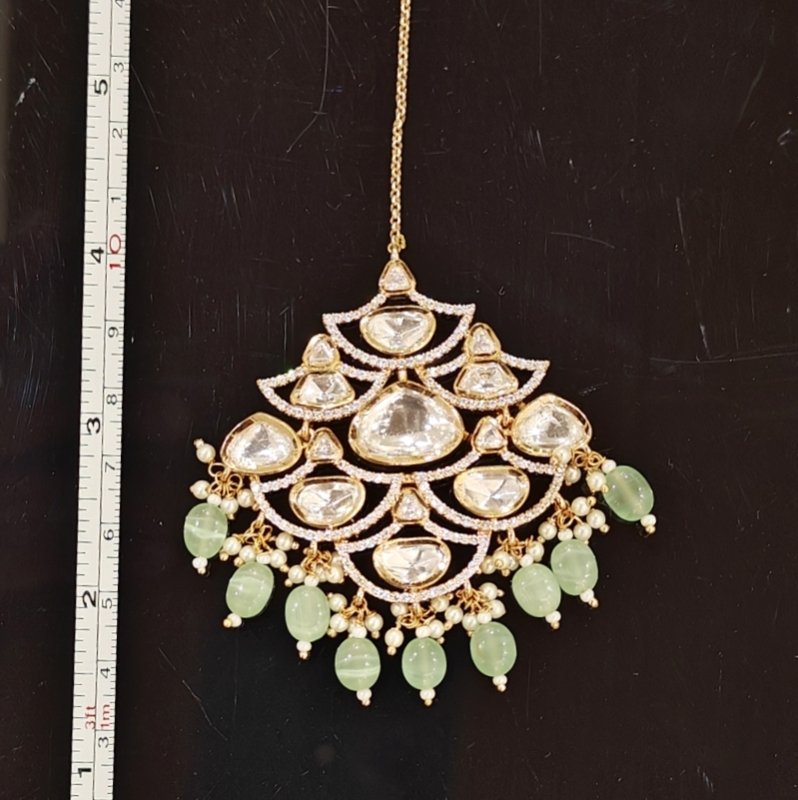 Very beautiful maangtikka made in diya pattern pattern crafted with uncut polki and beaded with mint green beads